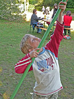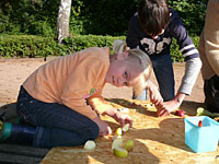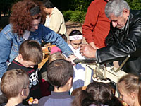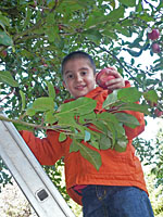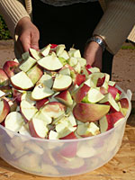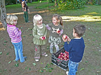Bei wunderschönem Spätsommerwetter treffen sich Eltern, Kinder und Lehrerinnen nachmittags auf dem Schulhof. Nachdem die Kinder ihren Eltern die Lieder vorsingen, die sie in den ersten Schulwochen lernen, dürfen sie die Äpfel pflücken. Manche schaffen es auch mit einem Apfelpflücker an einem langen Stiel. Danach werden die Äpfel verarbeitet.