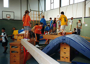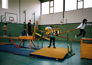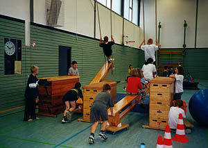 Um unseren Schülern neben dem regulären Sportunterricht die Möglichkeit zur „lebensnotwendigen“ Eigenerfahrung und Eigenverantwortung zu geben, verwandelt sich die Turnhalle unserer Schule jeden Freitag in eine abenteuerliche Gerätelandschaft.