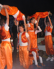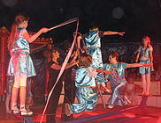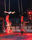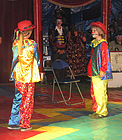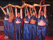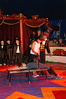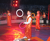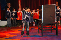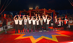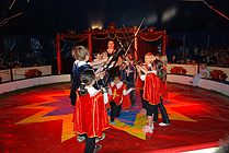 Nach einer 20-minütigen Pause ging es mit den Jongleuren weiter. Bunte Tücher, Bälle und Reifen wirbelten durch die Luft, Diabolo-Kunststücke waren zu bewundern und Hulahopp-Reifen drehten sich. Toll! Aber was passierte da? Ein Kind wurde von fiesen Clowns in eine Kiste gesperrt. Und dann steckte jedes der auftretenden Musketiere sein Schwert in die Kiste. Zum Glück zeigten die zappelnden Hände des Kindes, dass es unversehrt geblieben war, und es wurde gleich darauf befreit. "Einer für alle und alle für einen" war der Leitspruch der Musketiere. Nach so viel Spannung wurde es wieder lustig. Als die Clowns "Bienchen, Bienchen, gib mir Honig" vorführten, amüsierten sich alle königlich. Immer zwei Kinder gleichzeitig schwangen danach hoch oben am Trapez. An der letzten Übung waren sogar vier Kinder beteiligt. Die Zuschauer staunten! Nach einem weiteren Auftritt der Clowns eroberten die Akrobaten die Manege. Sie bogen sich zu Brücken, machten Handstand, Saltos und Spagat und stellten sich zu immer neuen großen Menschen-Pyramiden auf!