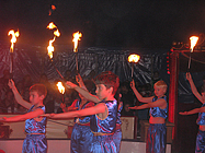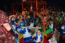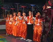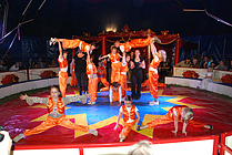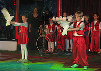 Konzentriert und gewandt balancierten Jungen und Mädchen auf dem Drahtseil und begeisterten das Publikum mit ihrem Geschick. Ein Clown versuchte es auf einem Gummiband und brachte die Zuschauer zum Lachen. Danach wurde es magisch. Die Zauberer verknoteten auf unsichtbare Weise bunte Tücher, ließen Blumen wachsen, einen Teppich schweben und zersägten eine Jungfrau. Dann überraschten uns wieder die Clowns mit ihren Späßen. Im Umgang mit den weißen Tauben war Geduld gefragt. Ganz behutsam wurden sie von den Kindern dazu gebracht, das zu tun, was sie sollten. Sie liefen durch kleine Reifen, über winzige Leitern, über ein Laufrad, eine glitzernde Kugel und fuhren auf einem Taubenkarussel, bis sie sich schließlich alle in einem Körbchen versammelten. Auch dafür gab es großen Applaus! Eindrucksvoll trugen danach die Fakire ihre brennenden Fackeln in die Manege. Glasscherben und Nagelbrett konnten sie nicht erschrecken. Gemeinsam hoben sie eine 10 Meter lange weiße Tigerpython hoch!